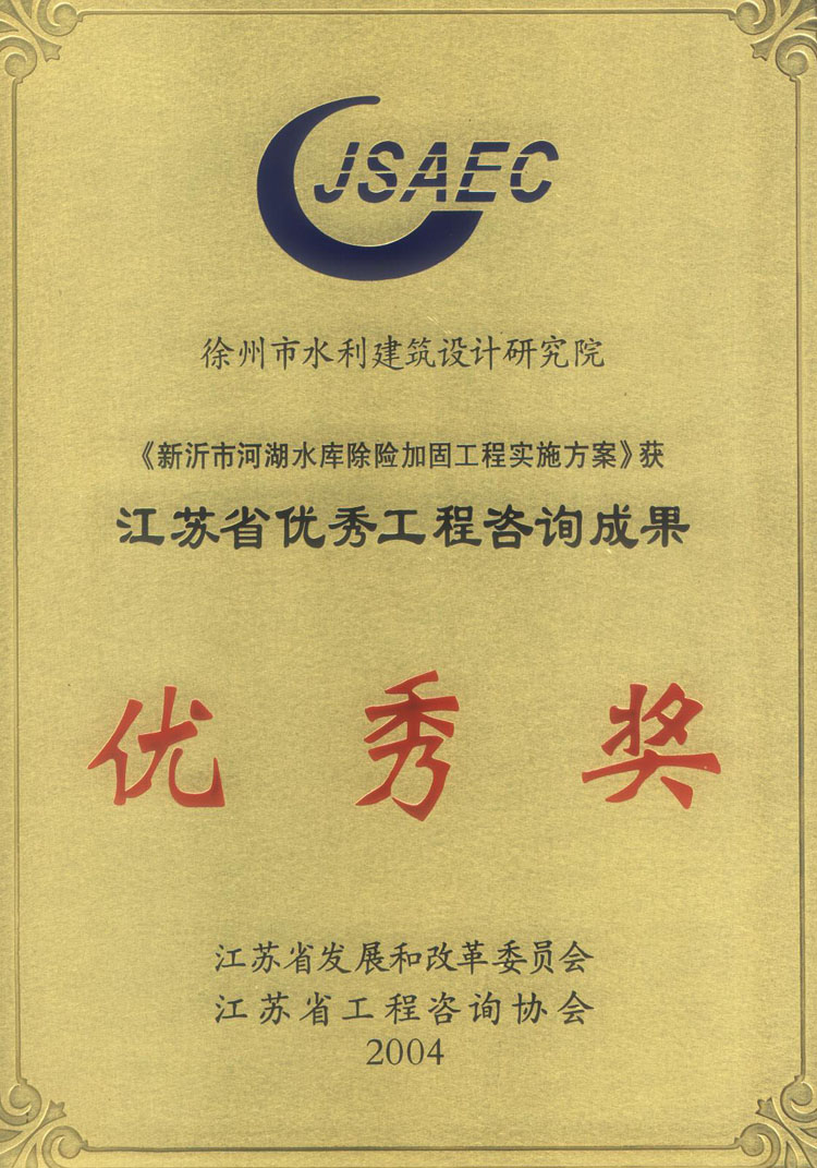 《新沂阿湖水庫除險加固工程實(shí)施方案》省咨詢(xún)成果獎(2004)
